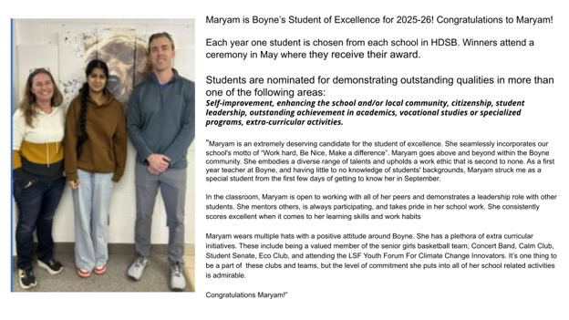 It is an honour and privilege to serve the Boyne Community as principal. I received the warmest of welcome from staff and students alike and these past two days have felt like a “homecoming”. To see how the students have grown in the last four years is a joy. The best was to hear them say “Are you Mrs. Khan? I remember you!” I look forward to connecting with all of you at some point in the future.